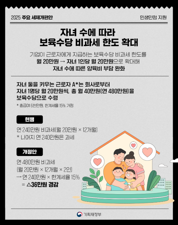 자녀 1인당 월 20만 원 비과세 자녀 2명 → 월 40만 원 비과세